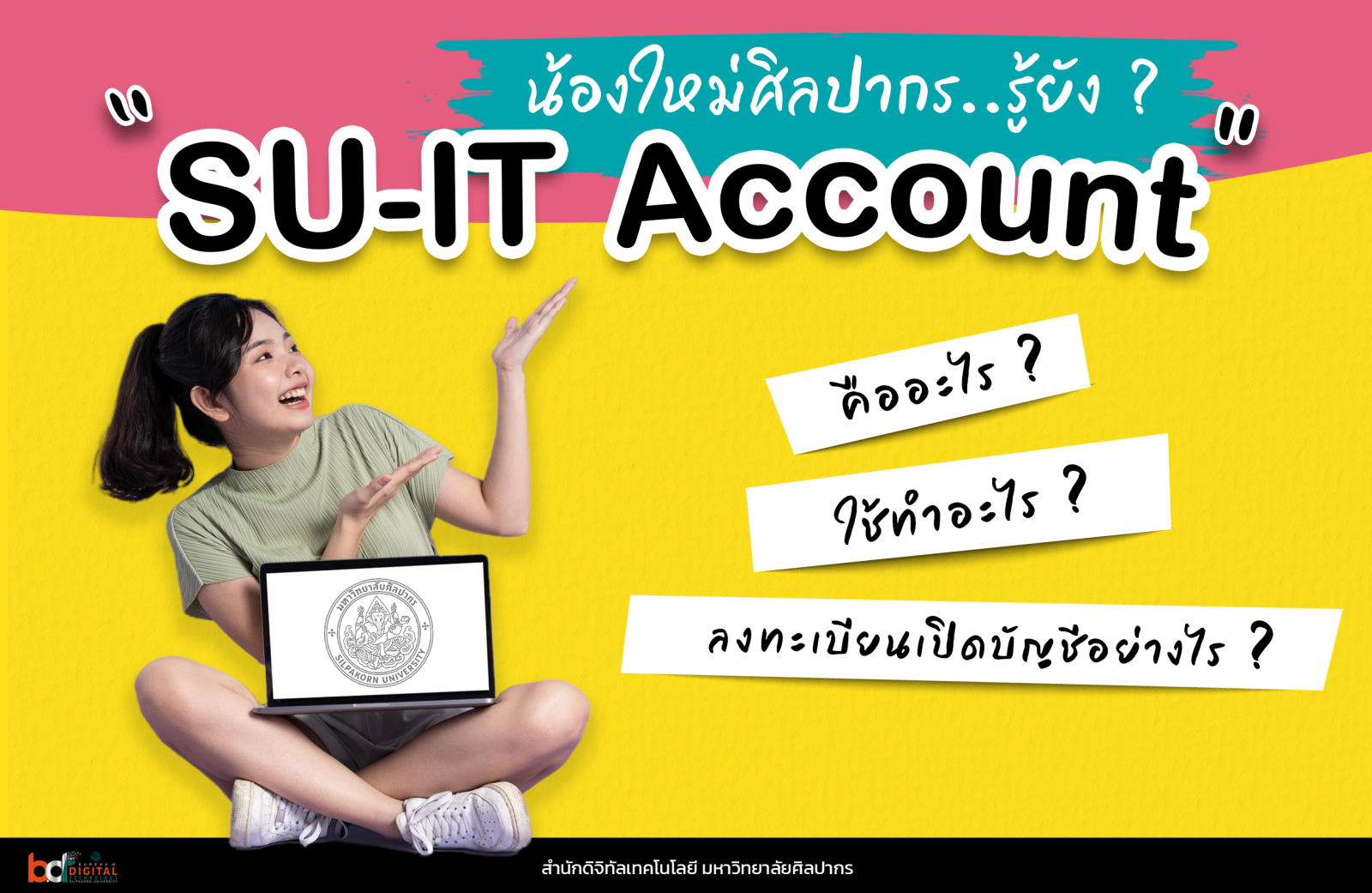 SU-IT Account คือ บัญชีผู้ใช้ไอที ของมหาวิทยาลัยศิลปากร เป็นกุญแจสำคัญในการเข้าใช้บริการต่าง ๆ ของมหาวิทยาลัย