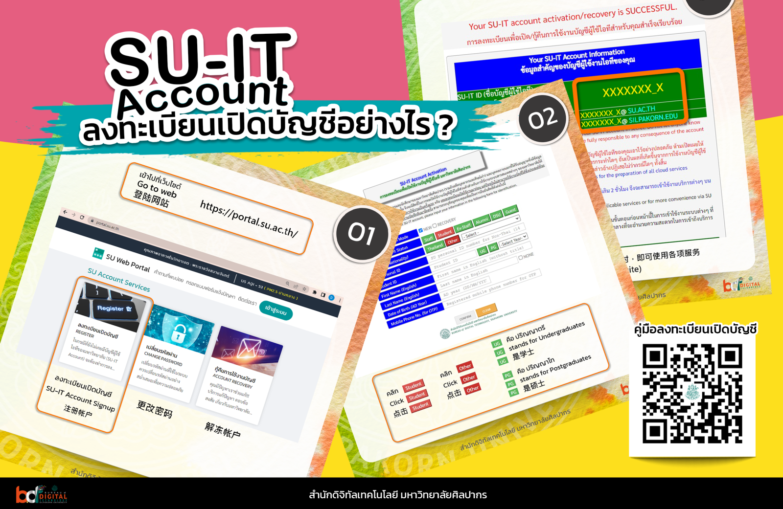 น้องใหม่ศิลปากรทุกท่าน สามารถรับสิทธิเข้าใช้บริการต่าง ๆ ที่ portal.su.ac.th เมื่อลงทะเบียนเปิดบัญชี SU-IT Account