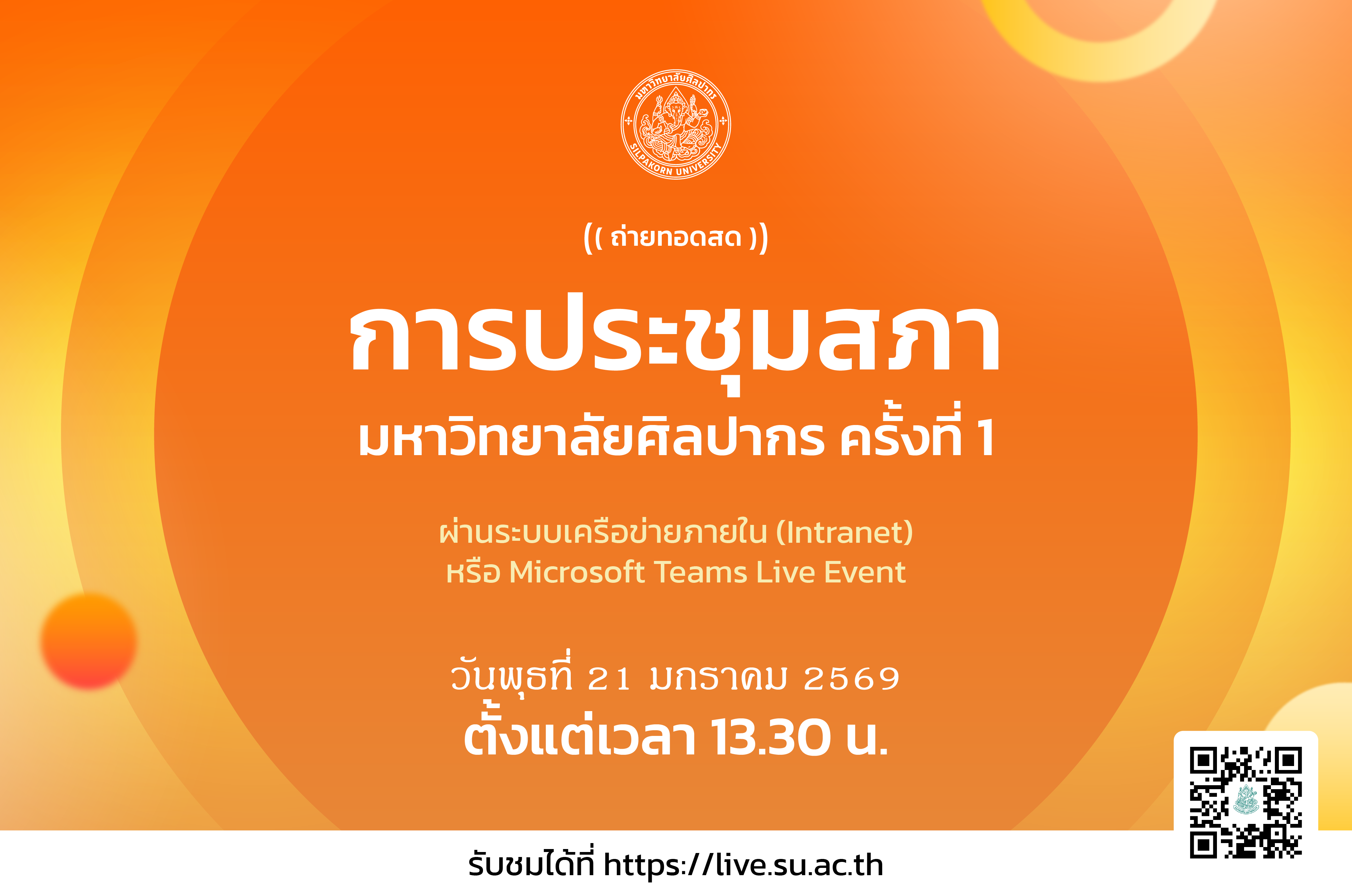 เชิญรับชมถ่ายทอดสดผ่านเครือข่ายภายใน (Intranet) หรือ Microsoft Teams Live Event “การประชุมสภามหาวิทยาลัยศิลปากร ครั้งที่ 1/2569” ในวันพุธที่ 21 มกราคม 2569 ตั้งแต่เวลา 13.30 น. ได้ที่ https://live.su.ac.th/