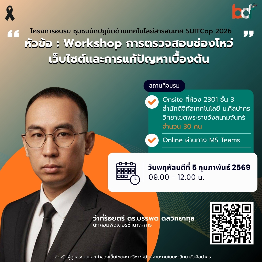 อบรม Onsite ที่ห้องปฎิบัติการคอมพิวเตอร์ 2301 ชั้น 3 สำนักดิจิทัลเทคโนโลยี ม.ศิลปากร วิทยาเขตพระราชวังสนามจันทร์ และอบรม Online ผ่านทาง Microsoft Teams | วันพฤหัสบดีที่ 5 กุมภาพันธ์ 2569 | เวลา 9.00 – 12.00 น.